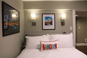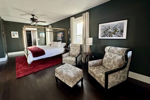 - Primary Suite (Paris): King Bed with Ensuite Bath & Sitting Area with Electric Fireplace.